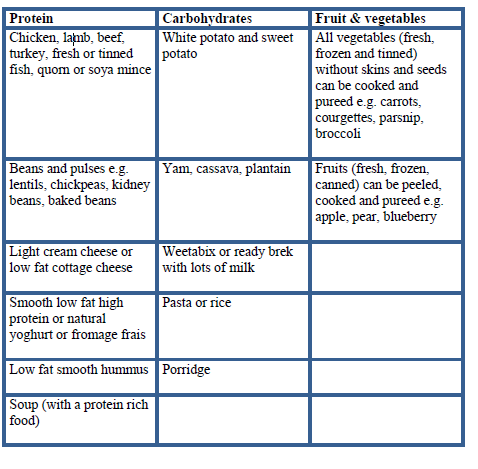 The main focus for your meals and snacks is protein so always eat this first. All of the foods in the table below will need to be pureed. Foods from other food groups such as carbohydrates, fruit and vegetables are also suitable, but are not a rich source of protein. If you choose to eat these then add some extra protein such as; protein or skimmed milk powder, high protein yoghurt, skimmed milk or low fat cheese to fortify them.