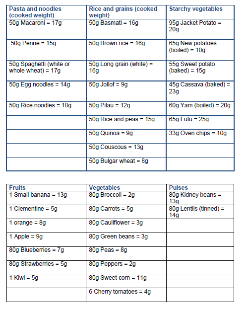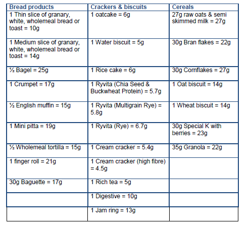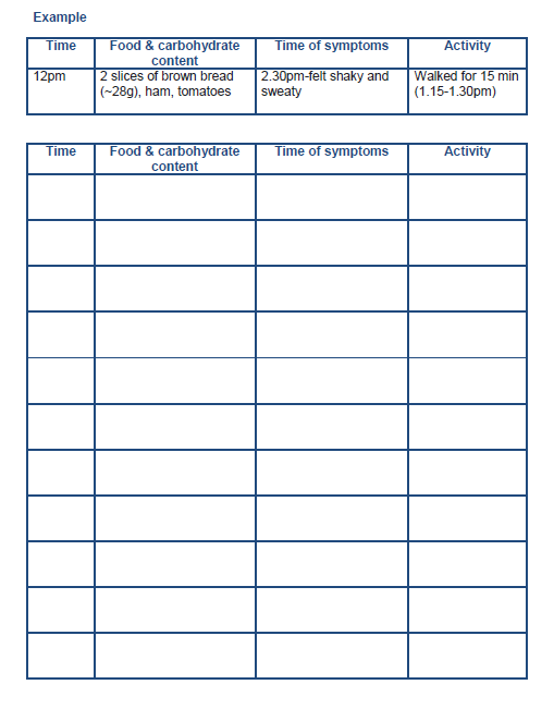To begin with, it may be helpful to calculate the grams of carbohydrates you are currently having at mealtimes and if this amount causes symptoms then decrease it. For example, if you are having 2 thin slices of bread (around 20g carbohydrate) and this causes symptoms, then halve this to 1 slice (10g carbohydrate) to see if this prevents reactive hypoglycaemia. At the back of this booklet you will find a list of common foods with their average carbohydrate content, as well as other resources that you can use to calculate the carbohydrate content of food. Use the food and symptom diary to record the effects of any dietary changes.