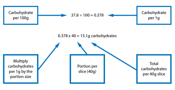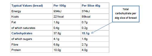 When reading the information on food labels the nutritional information is often given per 100 grams of food. When trying to work out the carbohydrate content, have a look to see if the information tells you how much carbohydrate is in a portion of the food you are likely to eat. The example above shows the carbohydrate content in a slice of bread. All carbohydrates are broken down in your body to glucose (sugars), so you should use the total amount of carbohydrates as opposed to that ‘of which sugars’.