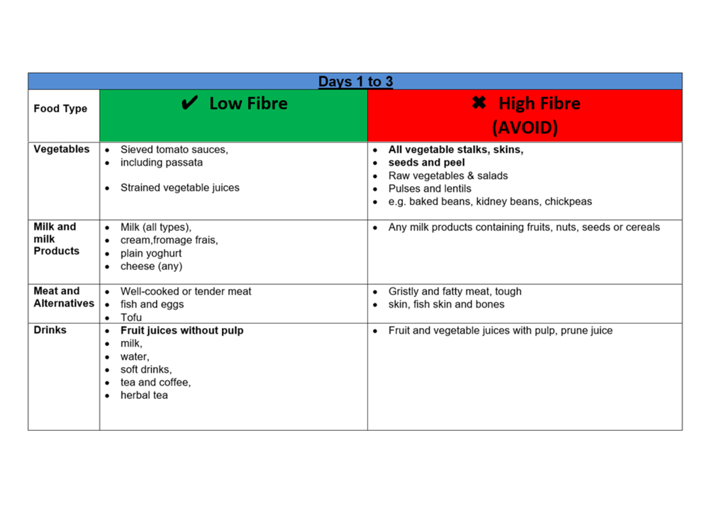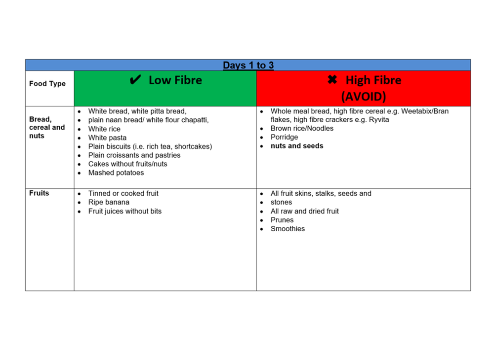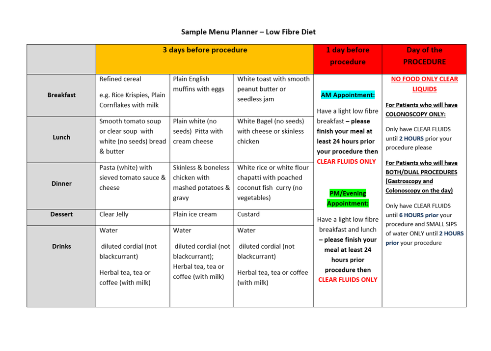 Bowel Preparation – Low Fibre Diet 4 days before endoscopy procedure