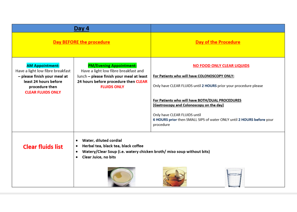 This is the dietary sheet advised for your bowel preparation- Please follow this as strictly as you can and for any further concerns please contact 020 8321 5191 / 020 8321 2585